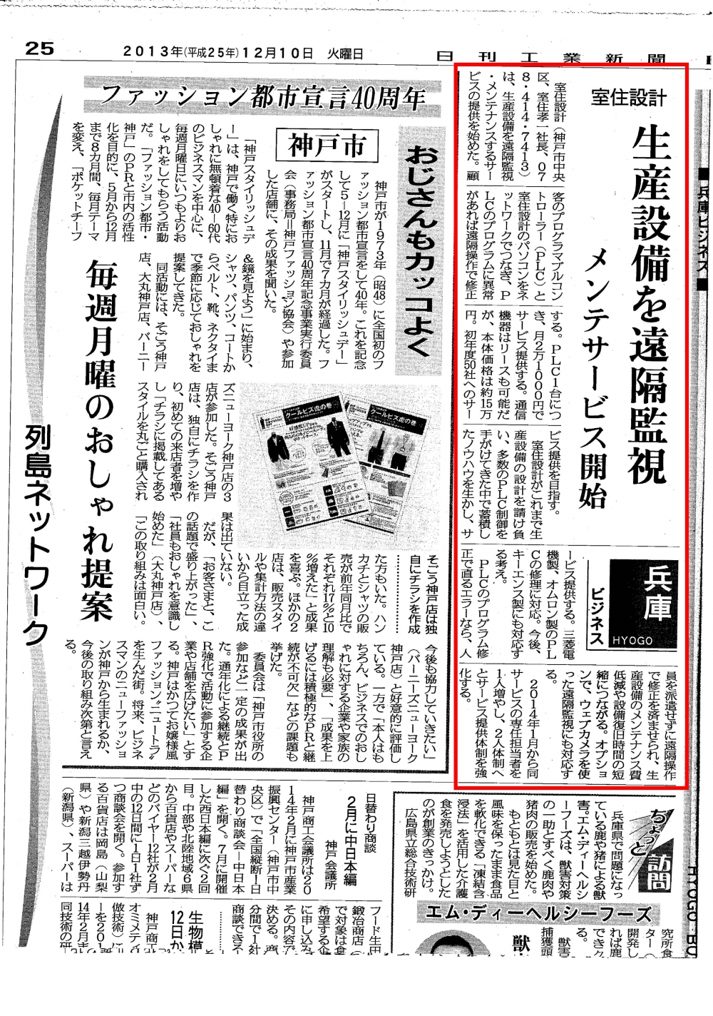 12月10日付の日刊工業新聞で弊社が新しく始めた遠隔監視・メンテナンスサービスが紹介されました。遠隔監視、デバッグの詳細は左バナーから進んでください。不明点あれば、弊社までお気軽に連絡ください。